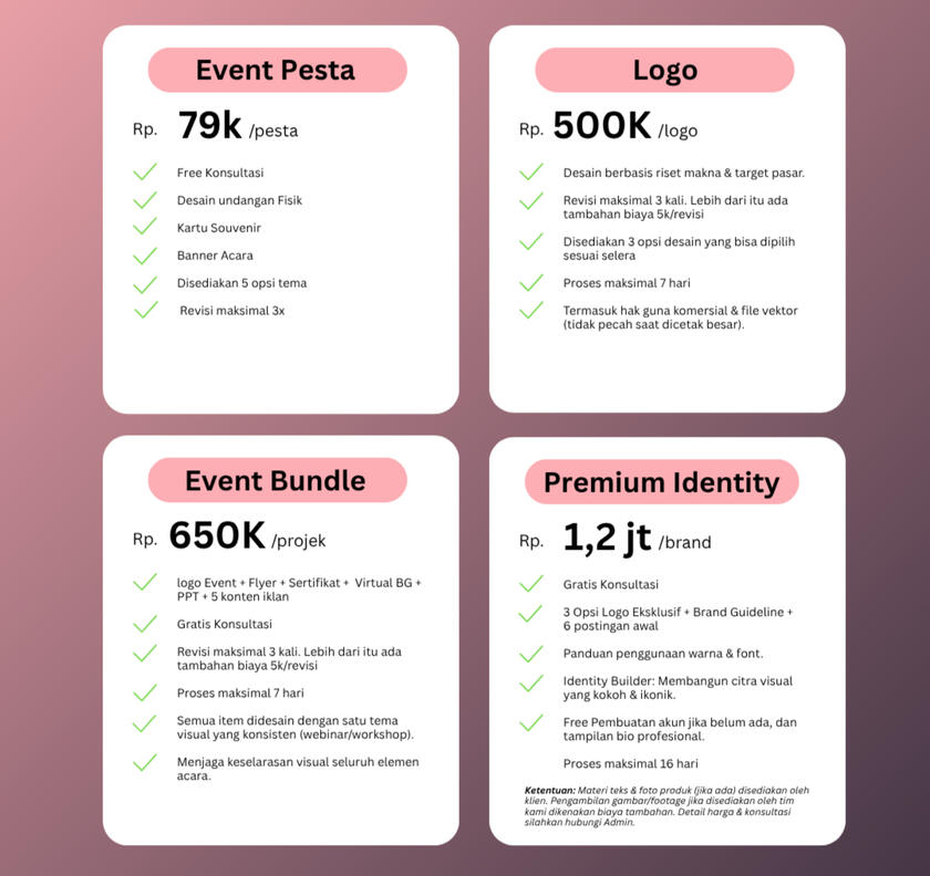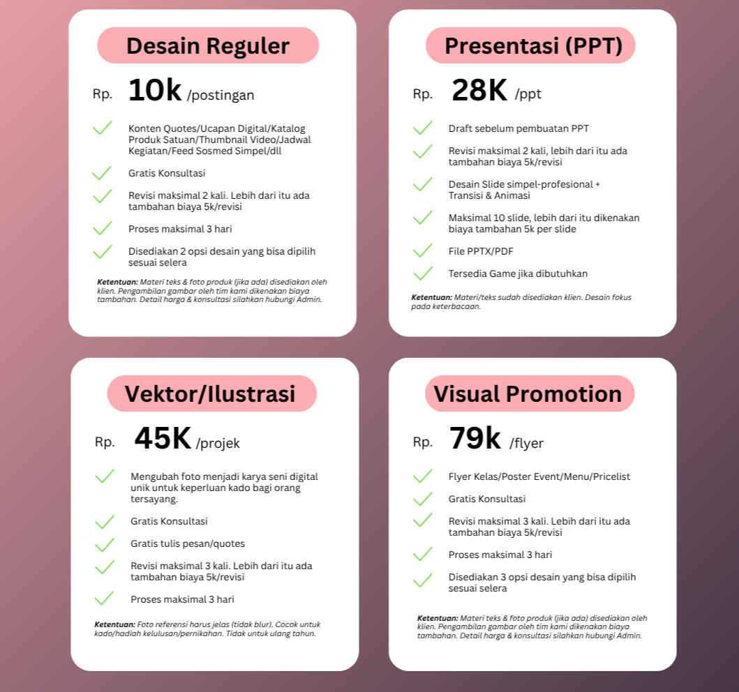 Visual yang rapi adalah kunci kepercayaan pelanggan. Kami menyediakan jasa desain grafis mulai dari konten harian sampai identitas logo premium.