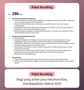 Mau fokus ngisi materi tapi pusing mikirin admit peserta atau spotlight pembicara? Serahkan tugas operator Virtual Meeting Anda kepada kami